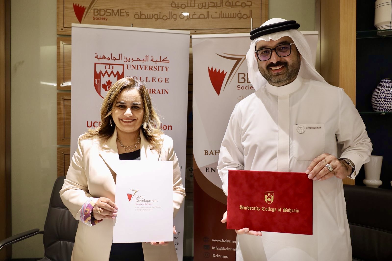 وقّعت كلية البحرين الجامعية اتفاقية تعاون مشترك مع جمعية البحرين لتنمية المؤسسات الصغيرة والمتوسطة، في خطوة تهدف إلى تعزيز الشراكة بين الجانبين ودعم برامج الريادة والابتكار لدى الطلبة. وقد وقّع مذكرة التفاهم كلاً من الدكتورة رنا صوايا رئيس كلية البحرين الجامعية، وسعادة النائب أحمد صباح السلوم رئيس جمعية البحرين لتنمية المؤسسات الصغيرة والمتوسطة، وذلك في مقر الجمعية.