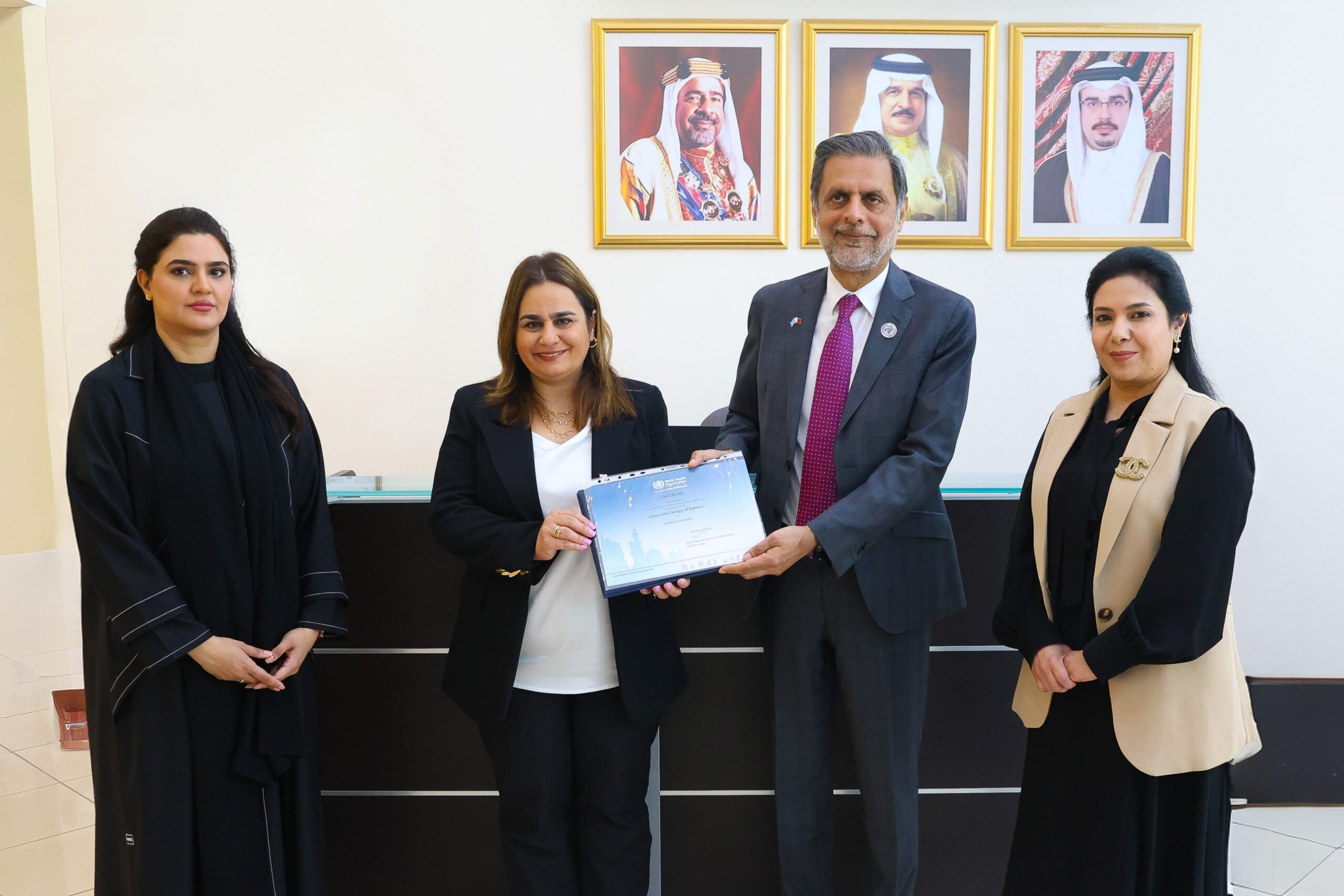 في إطار الشراكة بين وزارة الصحة ومنظمة الصحة العالمية في مملكة البحرين، منح مكتب منظمة الصحة العالمية بمملكة البحرين شهادة اعتماد” جامعة معززة للصحة “لكلية البحرين الجامعية، وذلك ضمن برنامج “الجامعات الصحية” الهادف إلى بناء سياسات صحية مستدامة داخل الجامعات وتوفير بيئة تعليمية وعملية صحية وآمنة.